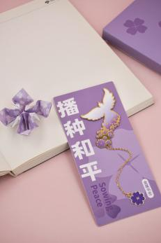 和平鸽展翅高飞,尾羽融入紫金草设计元素,紫金草与和平鸽融为一体,共同诉说着和平的美好愿景。