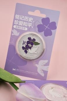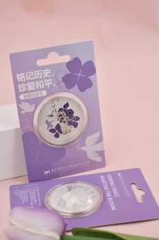 通过紫金草、和平鸽及纪念馆《和平》雕塑三大象征和平与希望的元素,结合高精度金属浮雕与烤漆工艺,打造出精美纪念币。浮雕效果使得图案更加立体生动,增强了视觉冲击力与触感体验,烤漆工艺使得纪念币在阳光下熠熠生辉,金色和银色版本都承载着对和平与希望的无限向往,是值得收藏的纪念文创。
