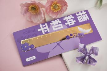 尺身采用金属材质,经过精细打磨,呈现出温润而富有质感的光泽,尺面的中央巧妙融入了和平鸽的形象,和平鸽尾羽绽放的紫金草与金属尺身相得益彰。