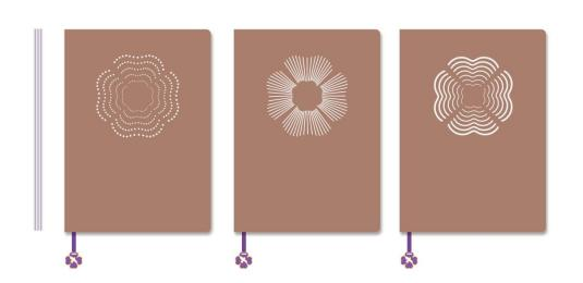 以三种不同设计形式表现紫金草花瓣,作为三款笔记本封面图案,笔记本采用近似馆标色的咖色,内页以金属紫金草挂饰作为书签,采用线装工艺,使用更便利。