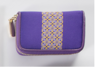 小钱包面料为电脑提花工艺,装饰纹样、配色与“紫金草国际和平纪念章绶带”一致,皮质包镶。