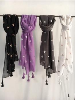 运用“和平之花”紫金草作为设计元素,4款配色分别为灰底银花、紫底银花、白底金花、黑底金花,尺寸为70*180cm,材质为棉麻。