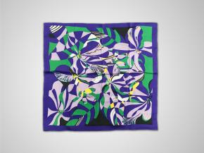 运用“和平之花”紫金草作为设计元素进行丝巾的装饰设计,采用紫色、绿色、黄色、黑色四套色,采用真丝斜纹缎。