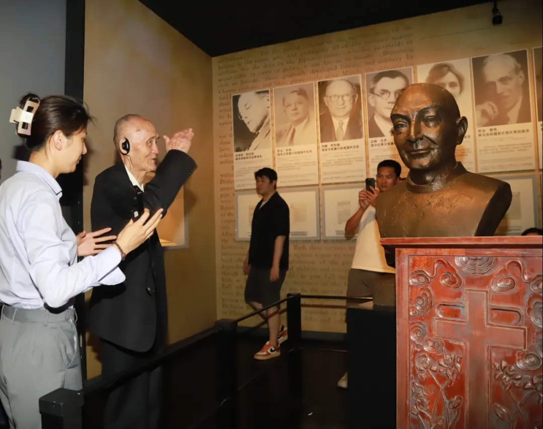 Led by the guide, Mr. Gao moved on to the “Humanitarian Assistance” section, where he learned about the stories of international friends who remained in Nanjing during the Massacre. Overcome with emotion, he gently touch the tombstone of John Rabe, a foreign hero who protected Chinese civilians, and offered a salute as a mark of respect. He also paid homage and saluted the statue of John Magee, commending his righteous deeds.