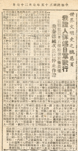 My Testimony Details the Atrocities of the Japanese Army reported the courtroom testimony of Xu Chuanyin, vice president of the Nanjing branch of the Red Swastika Society and head of the Housing Committee: “After the Japanese invaders entered Nanjing, they killed everyone they encountered.” “At that time, within the Nanjing city, there was no distinction between north, south, east, or west; the horrific scenes of Chinese civilians being massacred were everywhere, and the streets were filled with corpses.”