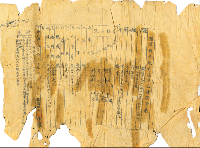 The Type B Investigation Form for Army Soldiers Who Died in Wartime clearly records that Mai Zizhuang held the rank of Second-Class Medical Warrant Officer, serving with the “Medical Unit of the 934th Regiment, 468th Brigade, 156th Infantry Division of the National Army”. He was a native of Nanhai County (present-day Dongguan City), Guangdong Province. He was killed in action during the breakout campaign in Nanjing on December 13, 1937, at the age of 29. The archives also document the names of his family members, including his father Mai Liangming, his mother Madam Cai, his wife Madam Mo, and his son Mai Diyao.
