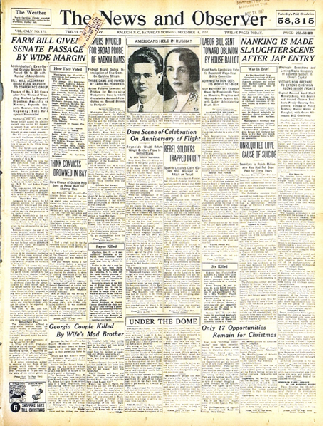 On December 18, 1937, The News and Observer reprinted an Associated Press report stating that “NANKING IS MADE SLAUGHTER SCENE AFTER JAP ENTRY.” At that time, many American newspapers carried the same report, indicating that the Nanjing Massacre was widely known internationally.