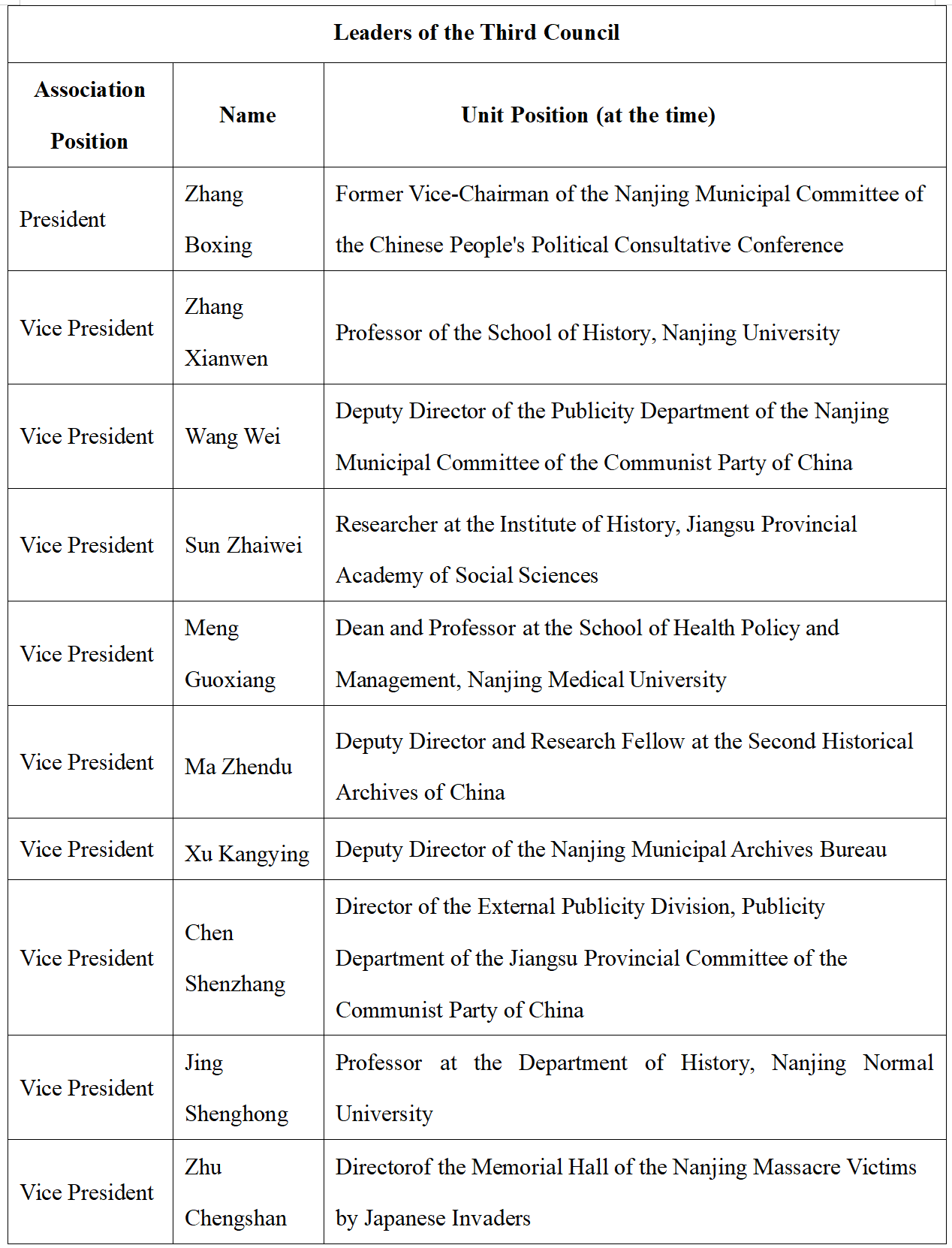 On August 14, 1995, The Research Association of the History of Nanjing Massacre by Japanese Invaders was established, affiliated with the Memorial Hall of the Nanjing Massacre Victims by Japanese Invaders. It is the earliest academic organization in China dedicated to the study of the history of the Nanjing Massacre. Composed of experts and social workers in Nanjing who engage in research on the Nanjing Massacre and related issues, it is an academic, non-profit, and regional social group. The main purpose of the association is to advance research on the Nanjing Massacre and the history of Japanese wartime atrocities, uphold historical truth, conduct patriotic education, and carry out international exchanges for peace and friendship, thereby contributing to peace and development for humankind. The association operates under the guidance and management of its supervisory unit, the Nanjing Federation of Social Sciences Circles, and the registration administration authority, the Nanjing Civil Affairs Bureau. In February 2023, the Sixth Congress of Members was convened, at which a new council was elected. The current president is Professor Zhang Sheng from the School of History at Nanjing University.