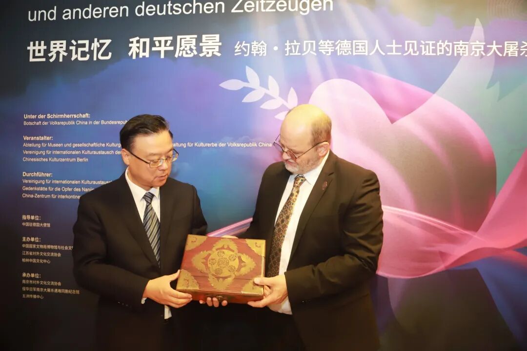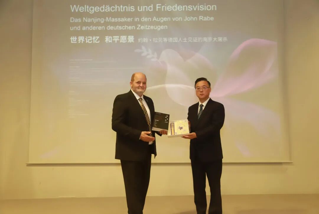 开幕式上,在“南京市民的感恩与拉贝家族的回响”环节,侵华日军南京大屠杀遇难同胞纪念馆馆长周峰向克里斯托夫·赖因哈特赠送中国国家档案局主编、国家记忆与国际和平研究院出品的《拉贝日记》全译本《拉贝日记:敌机飞临南京》,象征着南京人民对拉贝家族跨越时空的感恩之情。赖因哈特先生向纪念馆赠送了有关约翰·拉贝的历史和纪念资料。