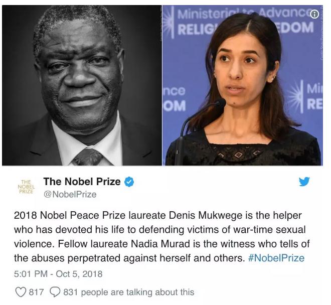 当地时间10月5日,2018年诺贝尔和平奖在挪威揭晓。挪威诺贝尔委员会宣布,将2018年诺贝尔和平奖授予刚果医生穆克维格(Denis Mukwege)和伊拉克雅兹迪族少女穆拉德(Nadia Murad),得奖理由是“两人致力于终止以性暴力作为战争武器”。
