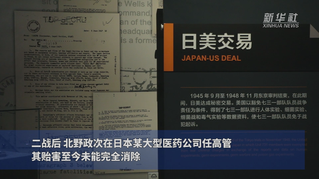 图片说明:侵华日军第七三一部队罪证陈列馆保存的揭露“日美交易”的相关史料(何山摄)