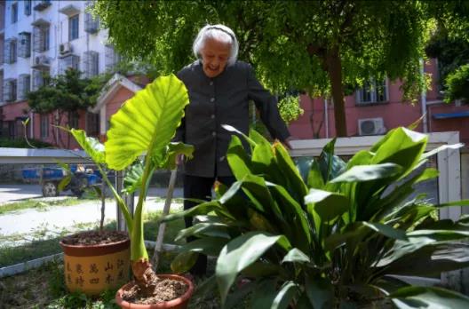 黄刘氏在小区里侍弄花草(新华社2018年4月19日摄)