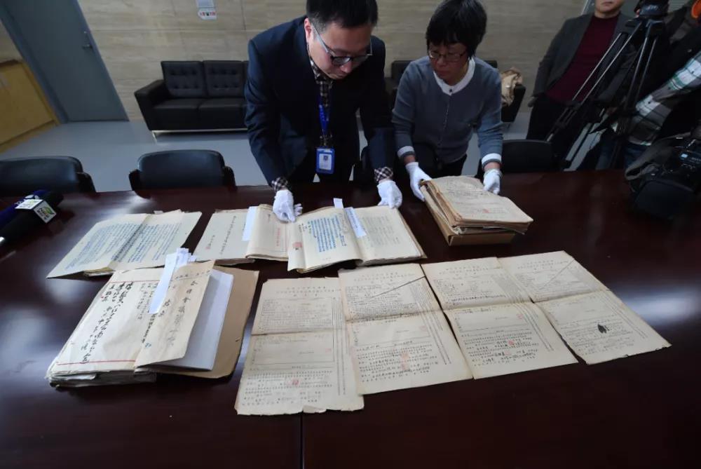 南京市档案馆人员展示相关档案。(2015年记者孙参摄)