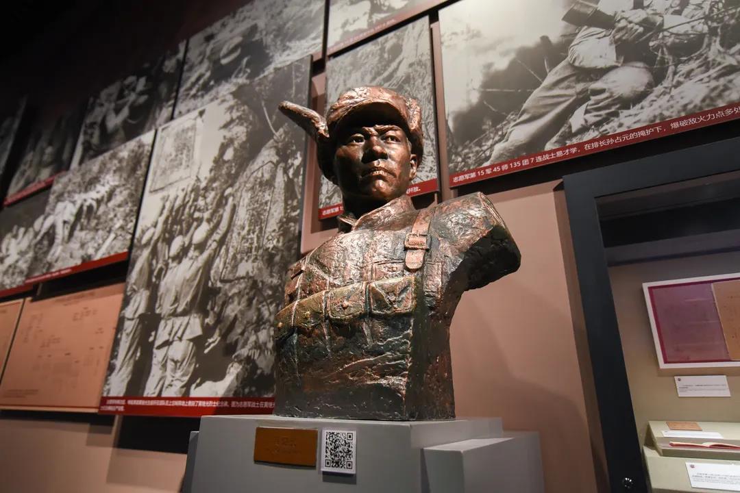 这是一盒灰白色的粉末,中间夹杂些许碎石粒、黑褐色杂质。“1952年10月14日,美军向上甘岭地区志愿军第15军防守的阵地发起进攻,战役历时43天。美军调集兵力6万余人,出动飞机3000多架次,对约3.7平方公里的阵地倾泻炮弹190余万发、炸弹5000余枚。我方阵地被削低了约两米,土石都被炸成了粉末。这个盒子里装的,就是战斗结束后一位战士从上甘岭上随手抓的石头粉末,里面还混杂着许多碎弹片。”孙从益的声音沉重,他的身畔,正是黄继光的雕像。这位在上甘岭战役中用胸口堵住碉堡枪口的英雄,激励和教育了几代人。