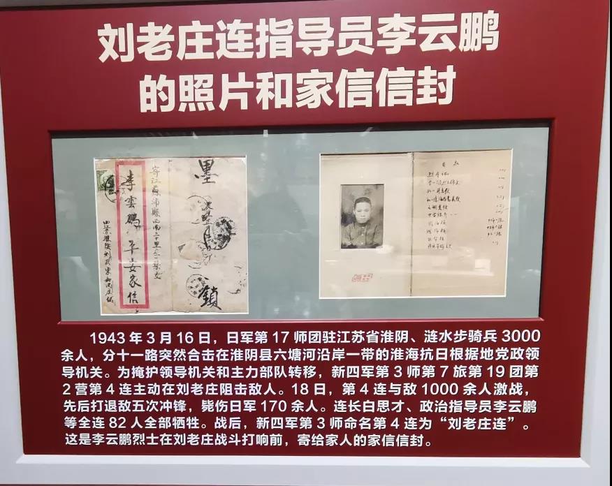 1943年3月,新四军第3师第7旅第19团第4连,在江苏淮阴刘老庄反“扫荡”战斗中遭日军1000余人合围。82名指战员与日军展开殊死肉搏,歼灭日军170余人,最后全部壮烈牺牲。朱德称赞他们是“我军指战员英雄主义的最高表现”。在“中流砥柱——中国共产党抗战文物展”专题展厅内,陈列了一份“刘老庄连”指导员李云鹏的家书信封和照片。