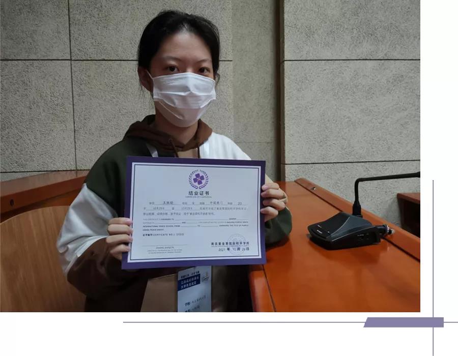 参观学习结束后,同学们顺利结业。纪念馆副馆长凌曦为同学们颁发“和平使者证书”,正如凌馆长所言:希望大家都能做一个和平的种子,让我们的世界变得更加美好!