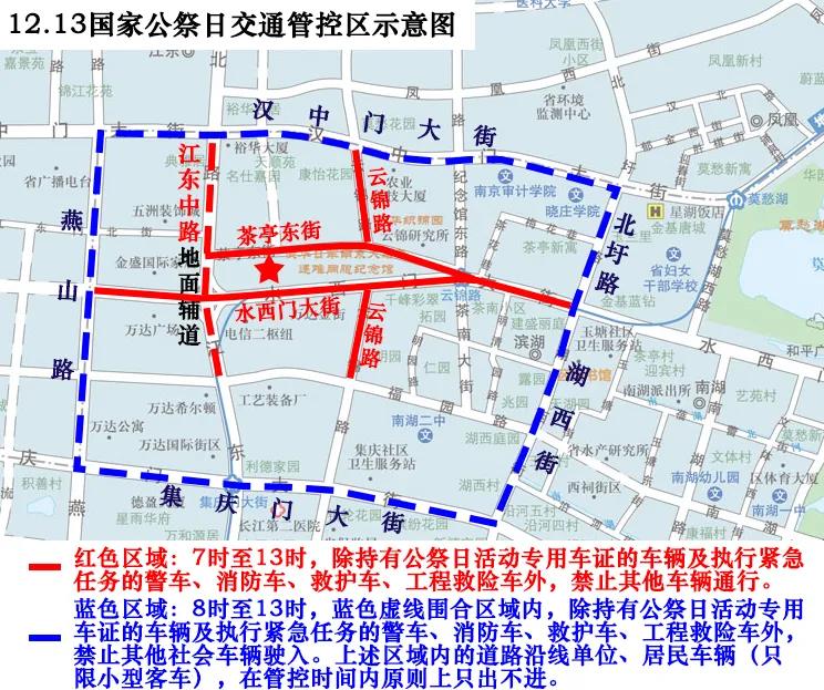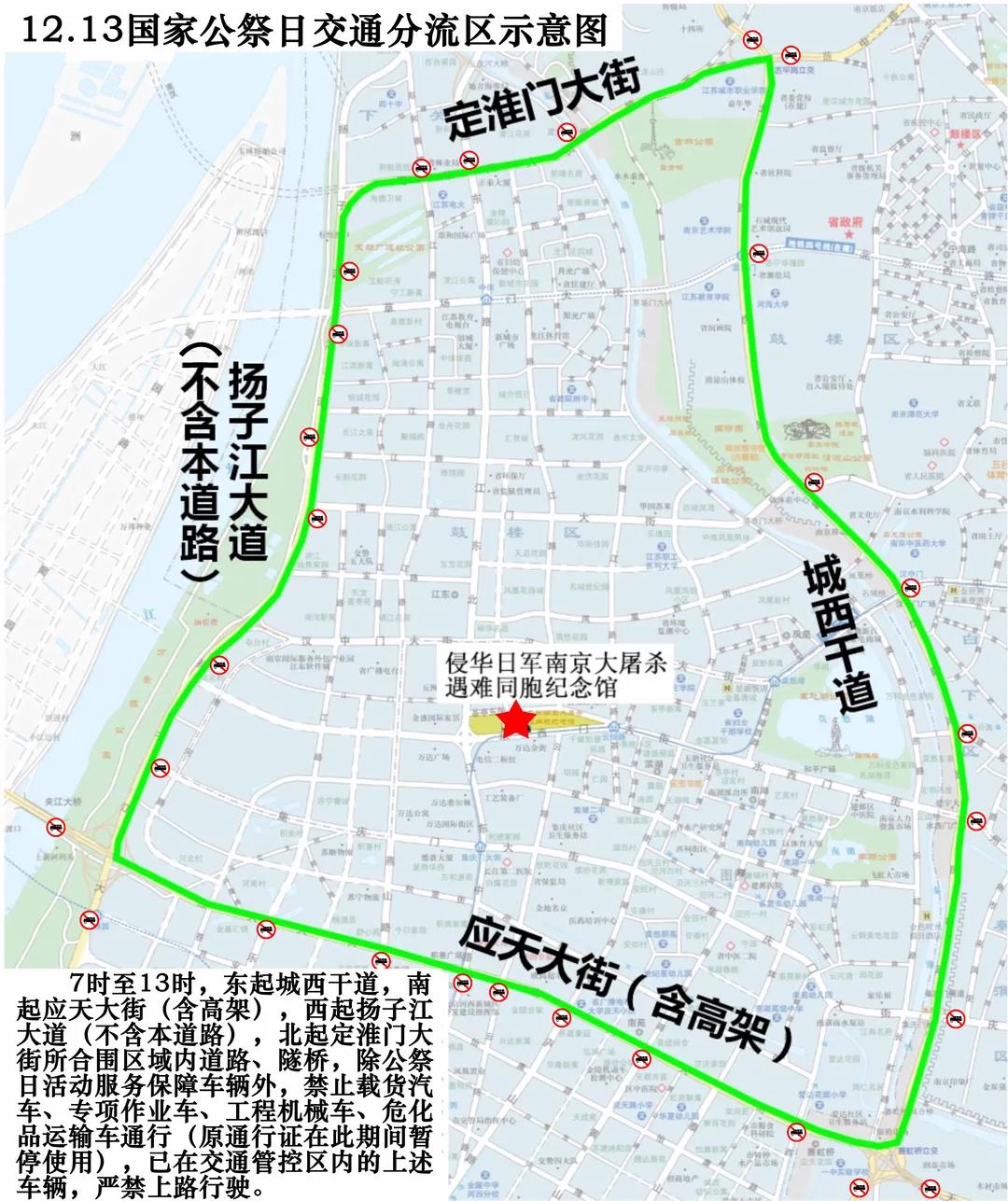12月13日7时至13时,东起城西干道,南起应天大街(含高架),西起扬子江大道(不含本道路),北起定淮门大街所合围区域内道路、隧桥,除公祭日活动服务保障车辆外,禁止载货汽车、专项作业车、工程机械车、危化品运输车通行(原通行证在此期间暂停使用),已在交通管控区内的上述车辆,严禁上路行驶。