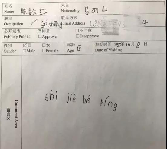 有的孩子还不会写字,用拼音写下“世界和平”,稚嫩的笔迹洋溢着爱国的热情。留言里的家国情怀,表达了中国人民不忘历史、缅怀先烈、开创未来的朴素情感,体现了中国人的志气、骨气、底气,令我们感动。