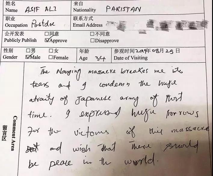 留言表明,许多外籍人士在参观后不仅了解了南京大屠杀基本史实,更增强了对和平的理解,发出了“南京大屠杀是一段可怕的历史”“愿死者安息,愿世界和平!”等感叹。南京大屠杀是国际人士共同见证的历史,有外籍人士的记录、国际友人的救援、世界媒体的报道、国际法庭的判决。