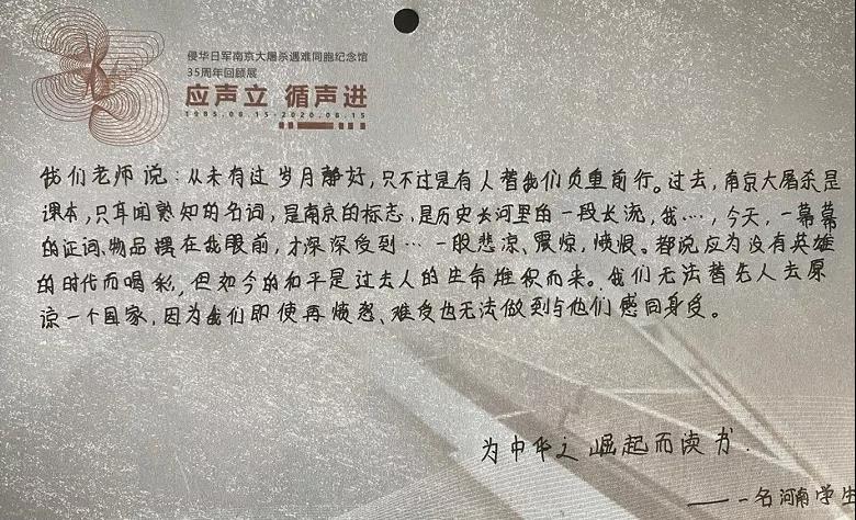 一位河南学生写道:过去,南京大屠杀只是耳闻熟知的名词,是历史长河里的一段长流。今天,一幕幕的证词、物料摆在我眼前,才深深感受到悲凉、震惊、愤恨……