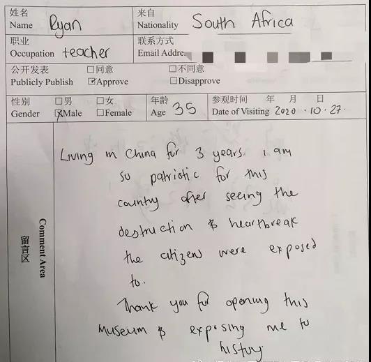 来自南非的Ryan写道:在中国居住3年,看到这些居民曾经遭受的破坏和心碎,我更爱这个国家。感谢纪念馆让我更了解历史。