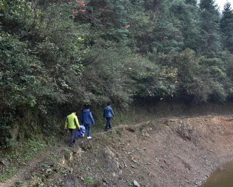 2021年11月21日,我馆利济巷分馆工作人员跟随李淑珍的小儿子前往江家洞进行实地考察,一行人沿着蜿蜒曲折的山路,来到当年日军关押李淑珍等当地女性的房子。老人口中原先的茅屋已经坍塌,但当时用石头垒造的地基仍存,如今的地基四周长满了荒草与杂树。
