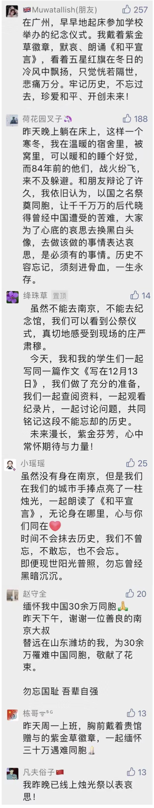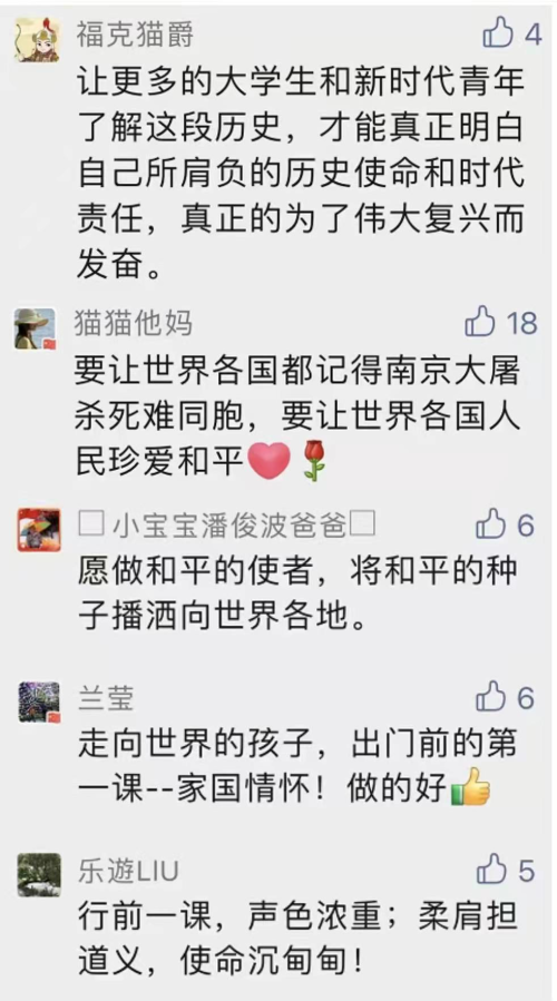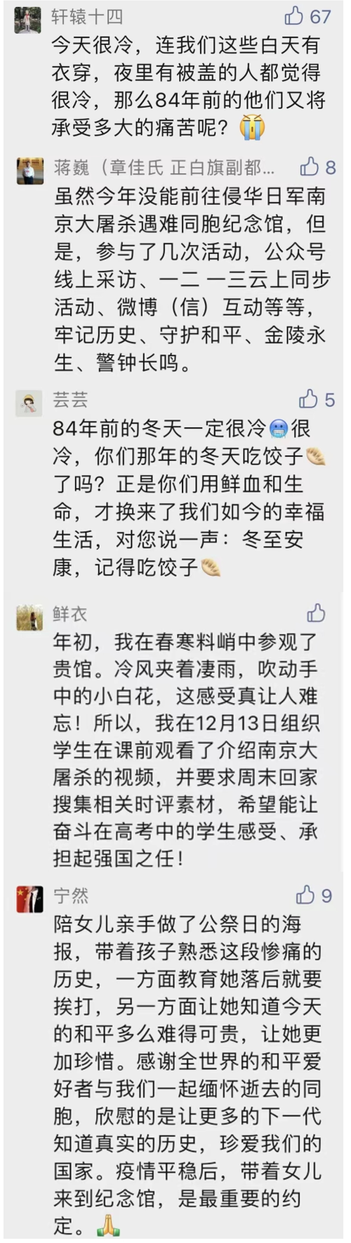 “让历史悲剧不再重蹈覆辙”“84年前的冬天一定很冷”“带着孩子熟悉这段惨痛的历史”……这些饱含情感的话语,道出心中那份家国情怀。