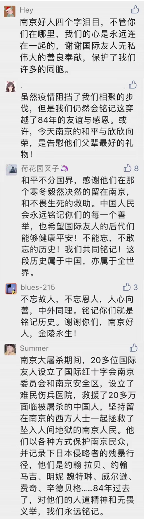 84年前,约翰·拉贝、约翰·马吉、罗伯特·威尔逊、贝恩哈尔·辛德贝格、克里福德·特里默等国际义士挺身而出,挽救了无数鲜活的生命。84年后,他们的后代们依旧心系南京,纷纷点燃蜡烛,缅怀逝者。