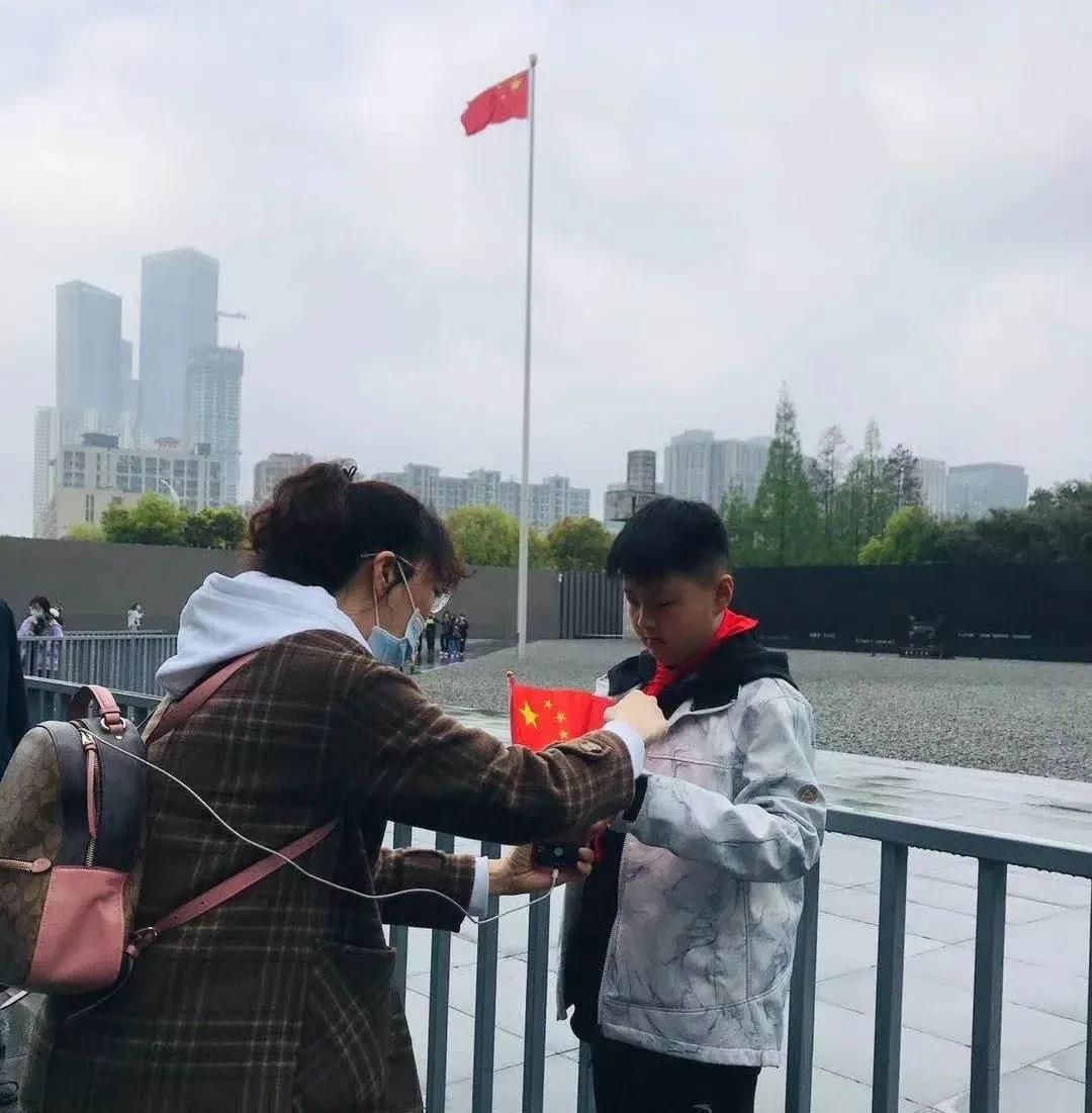 今年清明假期,来自山东潍坊的王女士带儿子陈旺阳前来参观。在进入史料陈列厅前,王女士郑重地为孩子系上红领巾。