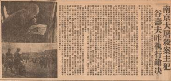 当时《新闻报》也称:“昨(二十六)日上午十一时三十分,特由该庭将被告谷寿夫,验明正身押赴雨花台刑场,依法枪决。行刑射手,为国防部警卫第一团班长洪二根,在围观市民欢呼鼓掌声中,一枪毙命。”