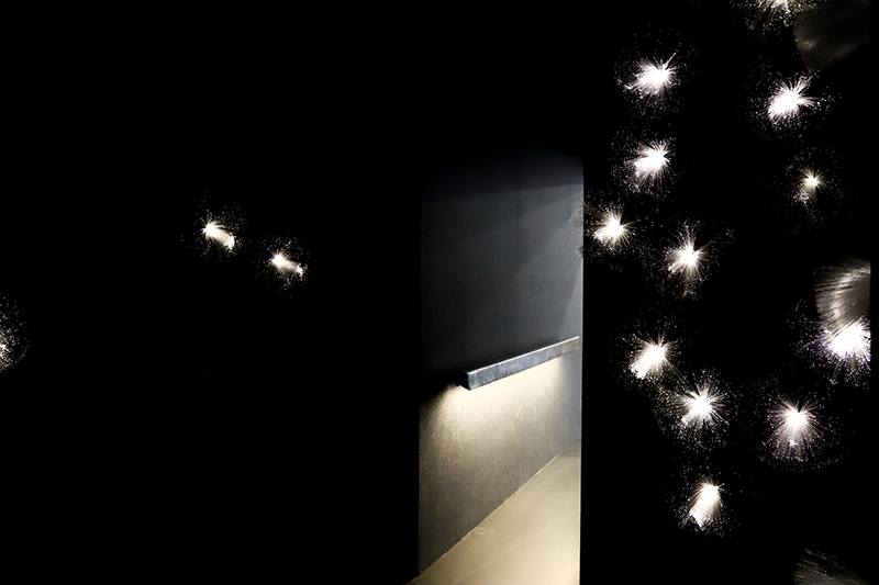 观众进入模拟碉堡装置体验,通道内的音量约为30分贝,而普通枪炮发出的声音高达130—150分贝。观众还可以通过扶梯爬上“碉堡”顶部,这里将声音引入水体,利用声波引发水面涟漪,同时映射出多变的水波纹光影。