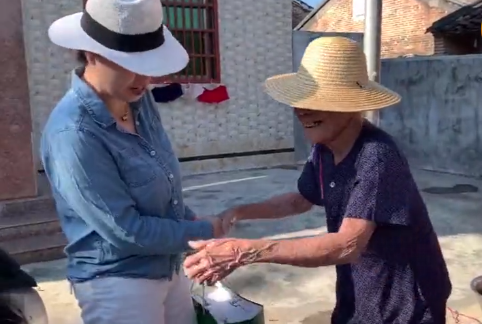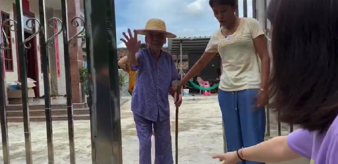 2020年7月,我馆工作人员为老人送去防疫用品。我们去时,奶奶正在外赶鸭子,看到我们非常开心。天气炎热,奶奶招呼我们喝冷饮。她身体硬朗,气色很好,还能喝冷饮,但有些耳背,有时候会腰疼。奶奶的家人说:“她现在饭量还行,还能活动。”