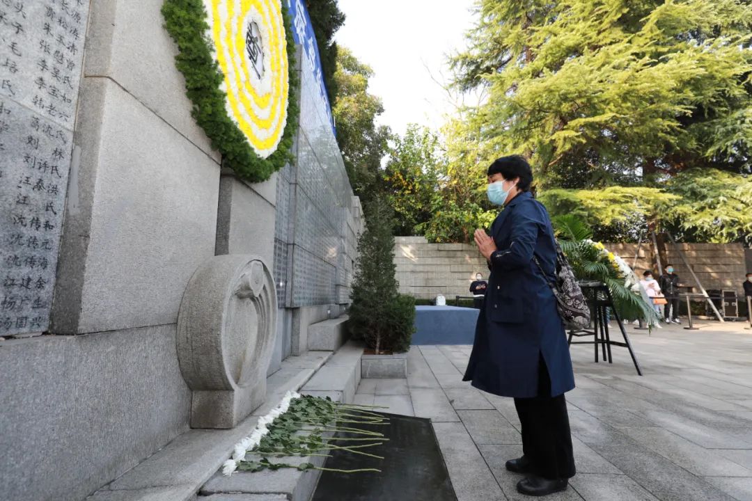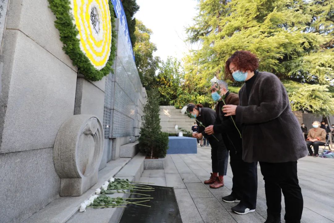 活动中,侵华日军南京大屠杀遇难同胞纪念馆工作人员与南京大屠杀死难者遗属代表余惠明,一同整理花篮挽联。全体人员手持菊花向南京大屠杀死难者三鞠躬。