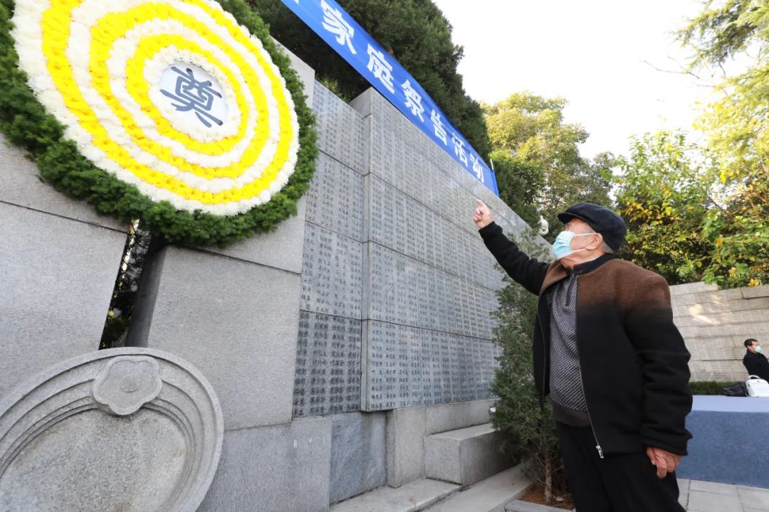 11月25日,南京,第九个南京大屠杀死难者国家公祭日即将来临,“2022年南京大屠杀死难者家庭祭告活动”在“南京大屠杀遇难者名单墙”前举行。幸存者艾义英、马庭宝、阮定东在家人的搀扶下献花,布满皱纹的手颤颤巍巍地指着亲人的名字,倾诉生死相隔85年的痛楚。