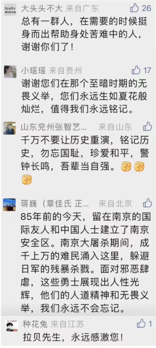85年前的11月22日,留在南京的国际友人和中国人士建立了南京安全区。面对邪恶肆虐,这些勇士展现出人性光辉。11月23日是南京安全区国际委员会主席约翰·拉贝的生日,网友纷纷留言:“我们永远不会忘记”。
