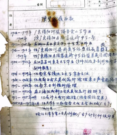 从履历表上看,陈斐然1939年离开南京后,1940年至1946年,任成都正合文具仪器行经理兼正声书局经理;1947年至1950年,他再次回到南京,任南京正利粮行经理;1951年至1952年,在上海任成都正合文具仪器行采购员;1953年至1955年4月,任长沙大成行经理,经营国际贸易;1955年5月开始,在天津市重工业局修配厂生产计划科任统计员。