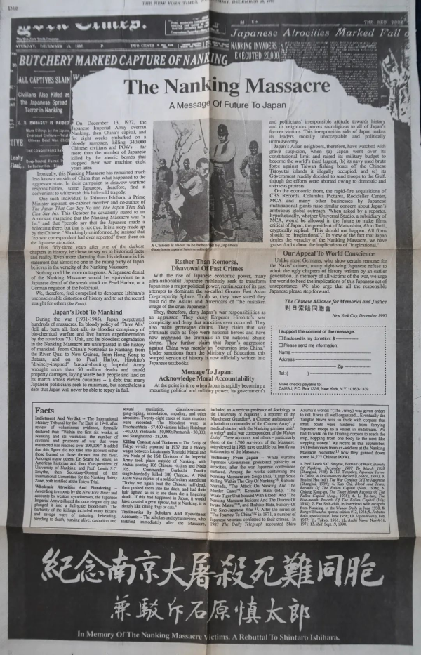 1990年12月26日,美国《纽约时报》第16页刊登的一则全页广告,“纪念南京大屠杀受难同胞”、“兼驳斥石原慎太郎”,文章衬底是1937年12月18日《纽约时报》头版刊发的“(日本)南京屠城”的报纸版面,广告显著位置是一位跪地中国人被日军持刀砍头的历史照片