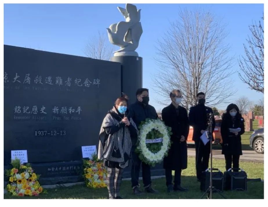 当地时间12月13日中午,多伦多华人团体联合总会和加拿大洪门民治党多伦多支部华人华侨在列治文山市爱恩墓园内南京大屠杀遇难者纪念碑前举行祭奠仪式,大家向南京大屠杀遇难同胞默哀、敬献花圈。多伦多市议员万利高,列治文山市议员邵浩然、崔冰辉等分别致辞。据悉,多伦多华人团体联合总会正是发起塑立南京大屠杀遇难者纪念碑的组织。