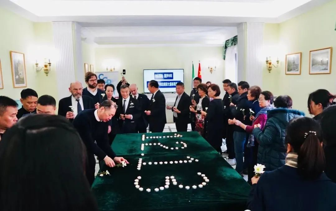 意大利当地时间12月12日,意大利江苏总商会、意大利米兰宋庆龄基金会、意大利意中交流协会,协同中国国际贸易促进委员会意大利代表处,以及旅意各大商协会,在米兰举办了“勿忘国耻,圆梦中华”海外侨团同步悼念南京大屠杀死难者活动。现场庄严肃穆,大屏幕滚动播放《人类的浩劫——1937南京大屠杀》史实展视频。全体与会人员胸前佩戴白花, 同唱中华人民共和国国歌。国歌唱毕,与会者在线参加世界和平火炬“云”接力,表达牢记历史、珍爱和平的心愿。当天还举办了烛光悼念活动。与会旅意商协会侨领代表们手捧蜡烛,在《公祭献曲》中围桌缓行。微微摇曳的烛光,如同点点泪光,人们追思遇难同胞,祈愿国富民强,世界和平。乐曲声结束后,全场肃立,向南京大屠杀死难者默哀三分钟。