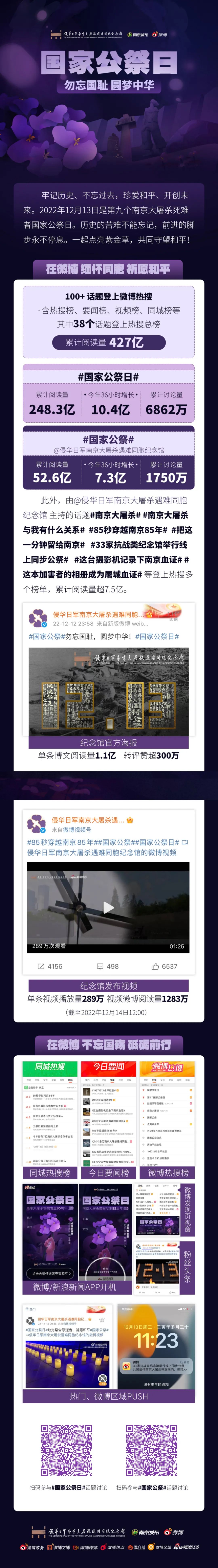 国家公祭日当天,相关微博话题占据全国热搜100多个,总阅读量达到427亿。由我馆主持的#南京大屠杀#、#南京大屠杀与我有什么关系#、#85秒穿越南京85年#、#把这一分钟留给南京#、#33家抗战类纪念馆举行线上同步公祭#、#这台摄影机记录下南京血证#、#这本加害者的相册成为屠城血证#等登上热搜多个榜单,累计阅读量超7.5亿。纪念馆官方海报单条博文阅读量1.1亿,转评赞超300万。