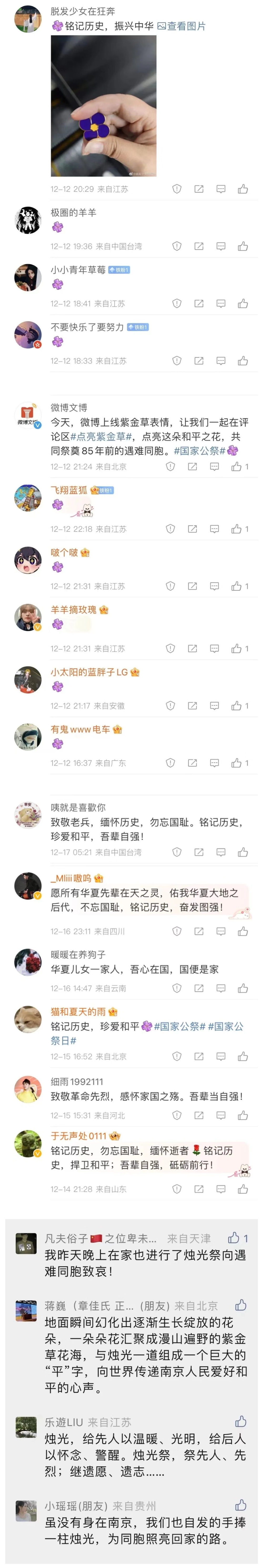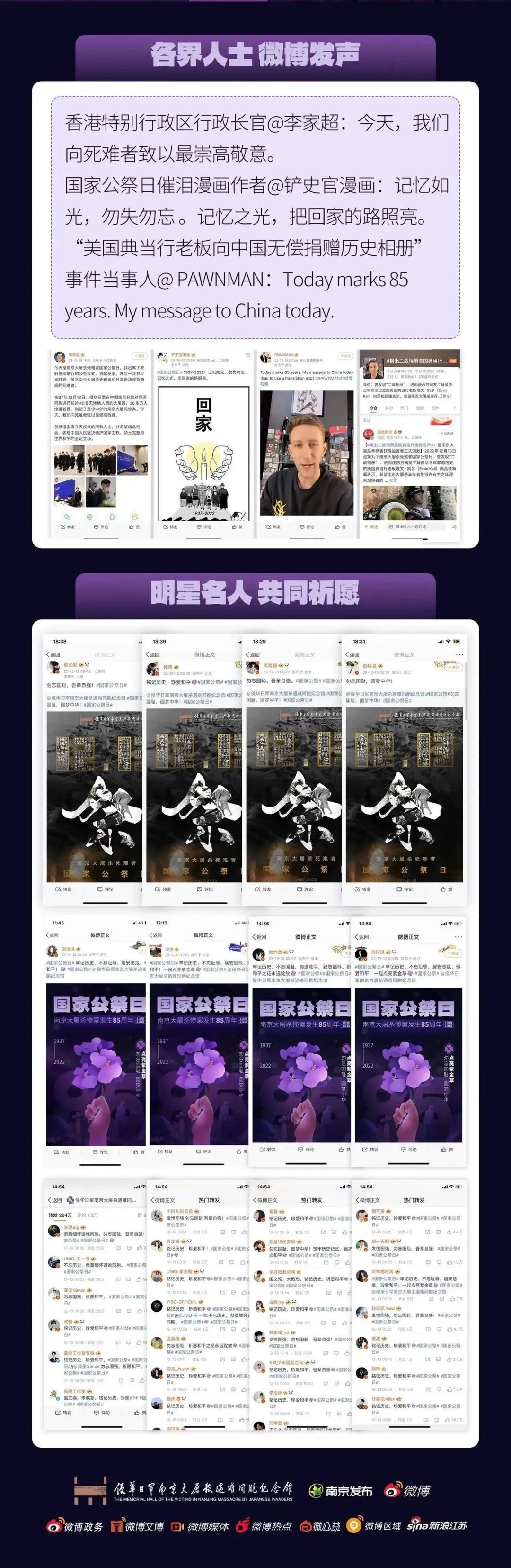 香港特别行政区行政长官@李家超、国家公祭日催泪漫画作者@铲史官漫画、美国典当行老板@PAWNMAN等社会各界名人,与亿万网友共同点亮紫金草,共同发声,悼念遇难同胞,祈愿和平。
