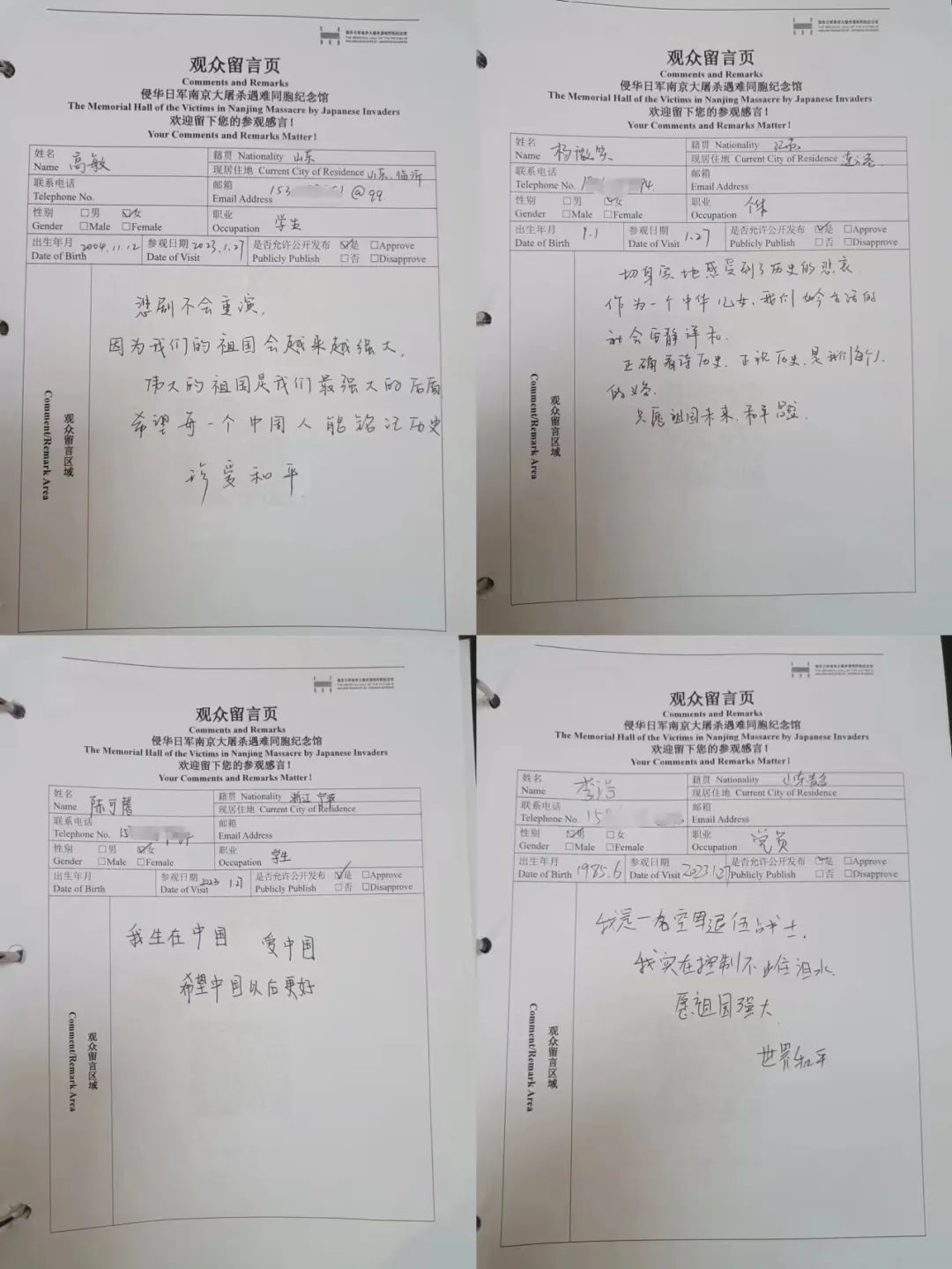 在《南京大屠杀史实展》尾厅留言区,观众们纷纷在留言簿上写下参观感言。春节期间,观众写尽19支笔芯,写满3000多页纸留言簿。除以往写的最多的“铭记历史”“勿忘国耻”外,今年春节留言簿上更多了“我爱中国”“祖国越来越强大”“和平昌盛”“发奋共创伟大中华民族复兴事业”等新年心愿。