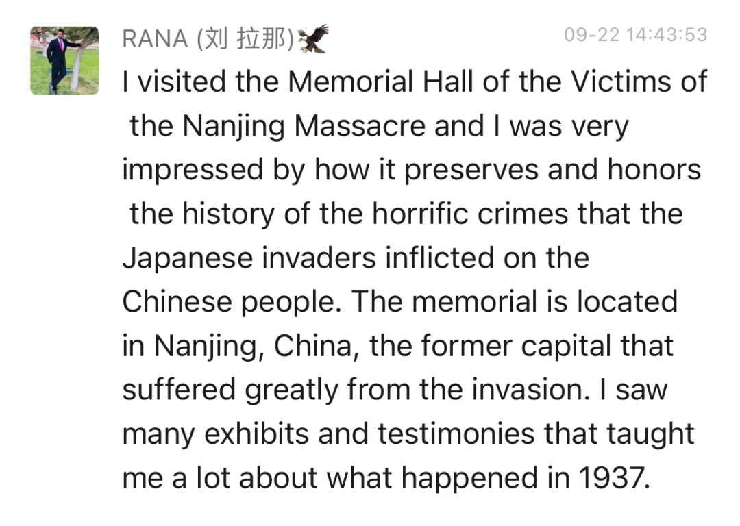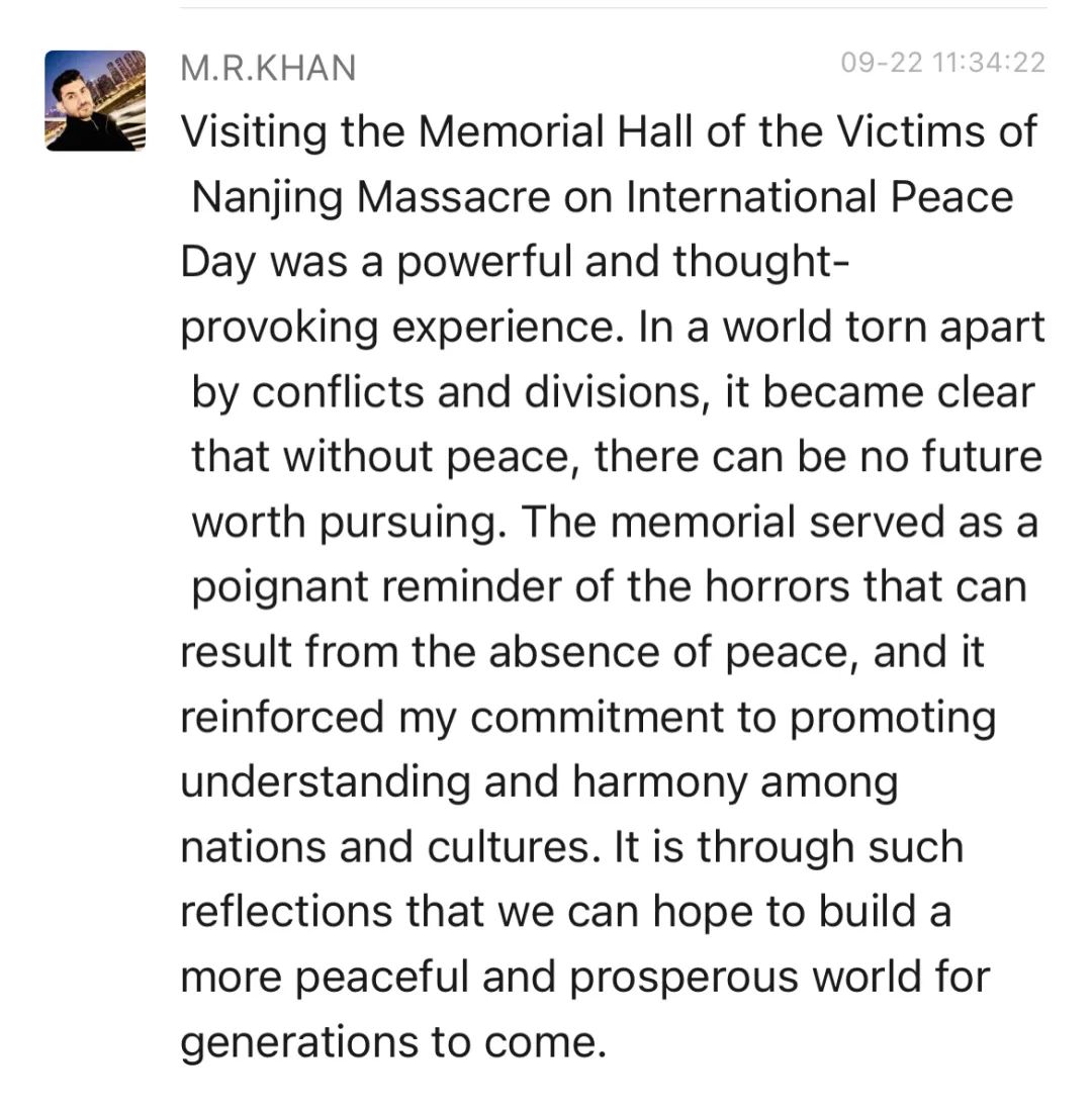 译:在国际和平日参观侵华日军南京大屠杀遇难同胞纪念馆是一次震撼而发人深省的经历。在一个因冲突和分裂而四分五裂的世界里,人们清楚地认识到,没有和平,就没有值得追求的未来。这座纪念馆深刻地提醒我们,缺乏和平可能造成恐怖,也让我感受到自己对增进各国和文化之间和谐相处担负着很重的义务。正是通过这种思考,我们才能希望为子孙后代建设一个更加和平与繁荣的世界。
