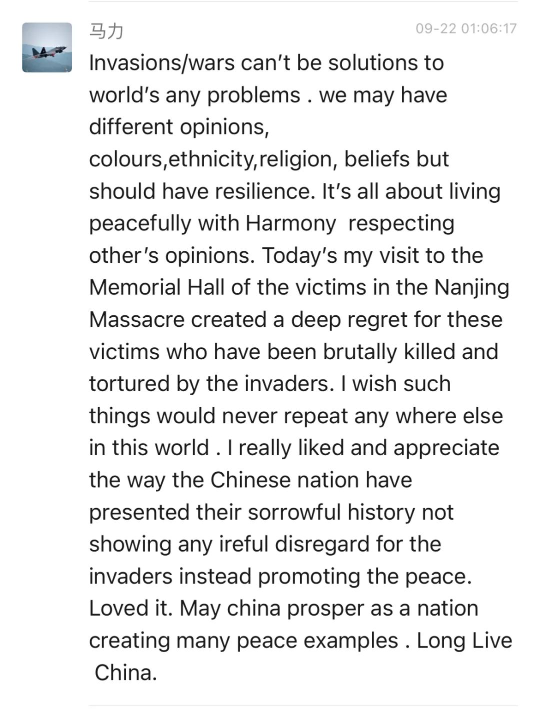 译:侵略/战争不能解决世界上的任何问题。我们可能有不同的观点、肤色、种族、宗教信仰,但是我们应该有韧性。一切都是为了和谐相处,并且尊重别人的观点。今天我来到侵华日军南京大屠杀遇难同胞纪念馆,对这些被侵略者残忍杀害和折磨的遇难者表示深深的哀悼。我希望这样的事情永远不会在这个世界上的任何地方重演。我非常敬佩中华民族向世人展现他们沉痛历史的方式,没有表现出对侵略者的愤怒与漠视,而是促进了和平。愿中华民族繁荣昌盛,树立和平榜样。中国万岁。