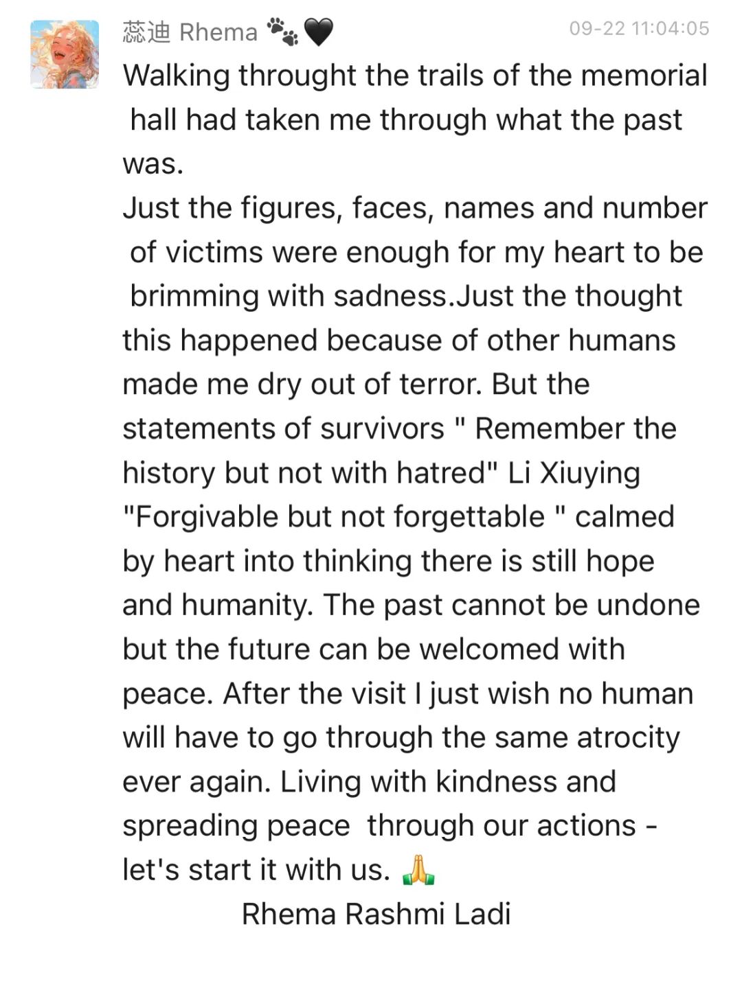 译:走在纪念馆的小径上,我回想起了过去。仅仅是数字、面孔、名字和受害者的数量就足以让我的心充满悲伤。一想到这一切悲剧的始作俑者同为人类,我就非常恐惧。但幸存者李秀英的陈述“记得历史而不是仇恨”、“可以原谅但不能忘记”,让我的心情平静下来,希望和人性依然存在。过去无法抹去,但未来可以和平地迎接。在这次访问之后,我只是希望没有人会再经历同样的暴行。带着善意生活,通过我们的行动传播和平——让我们从自己做起。