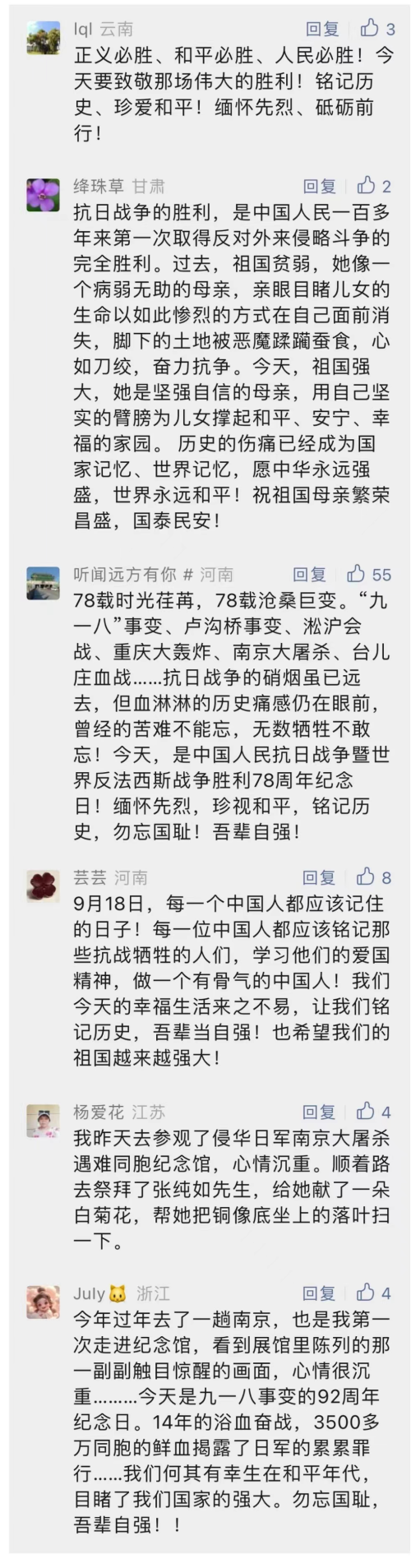 我们还设置了#九一八事变爆发92周年#等微博话题,大家在网络中“云聚集”。“铭记历史,警钟长鸣”、“国耻不能忘,吾辈必自强”、“中华民族不可忘却的历史”……网友接力传递历史,纷纷抒写心中的感想。
