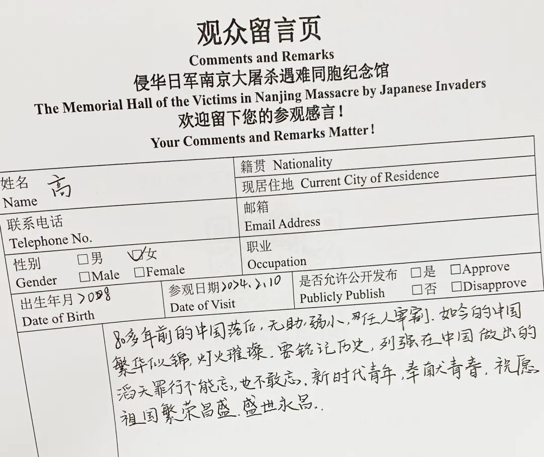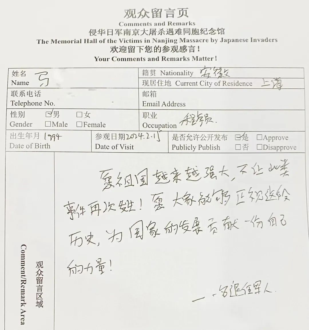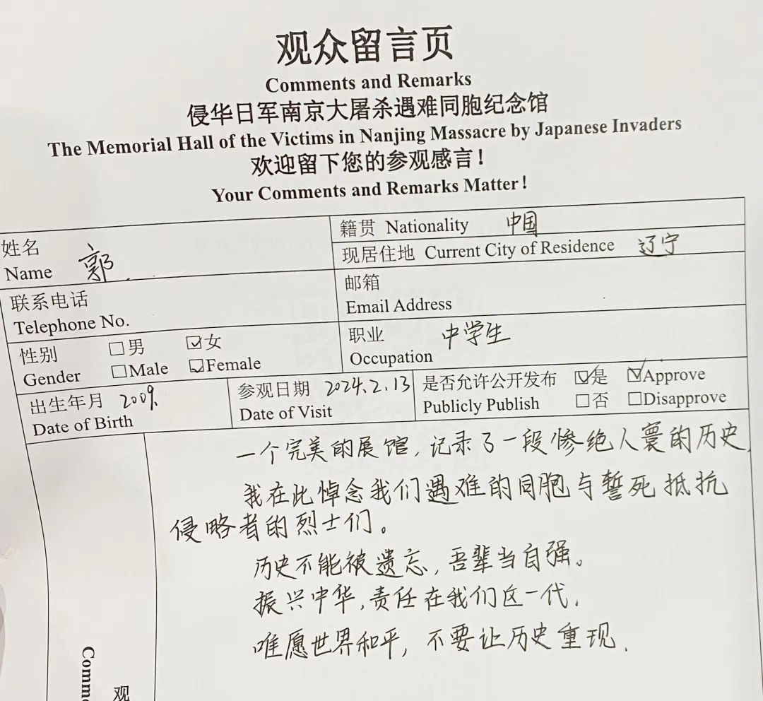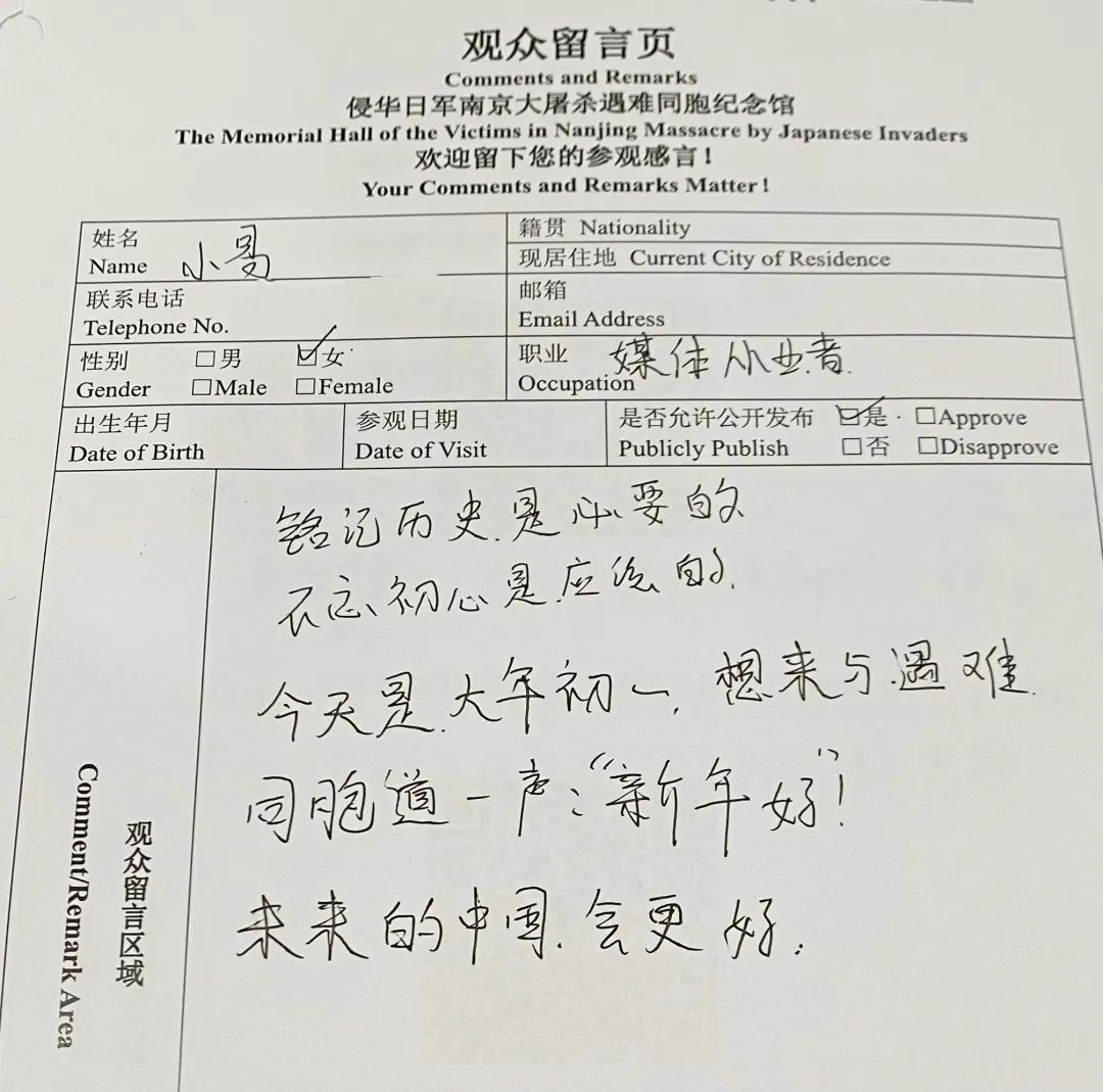 来自河北的观众写道:“今天是正月初一,举国欢庆春节,我们来到这里,只为铭记历史,铭记先烈。勿忘国耻,吾辈自强!祝祖国繁荣昌盛,越来越好!”