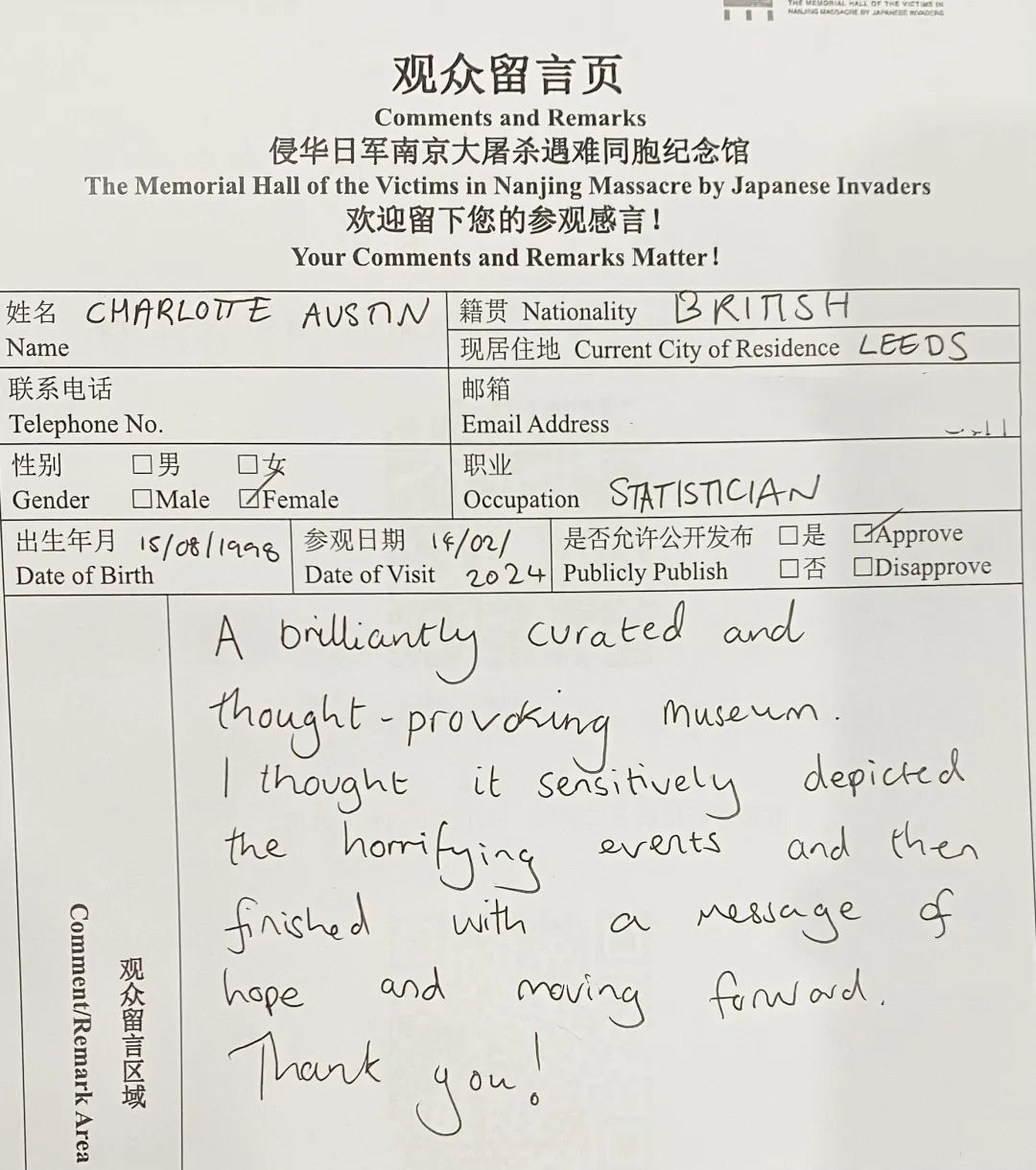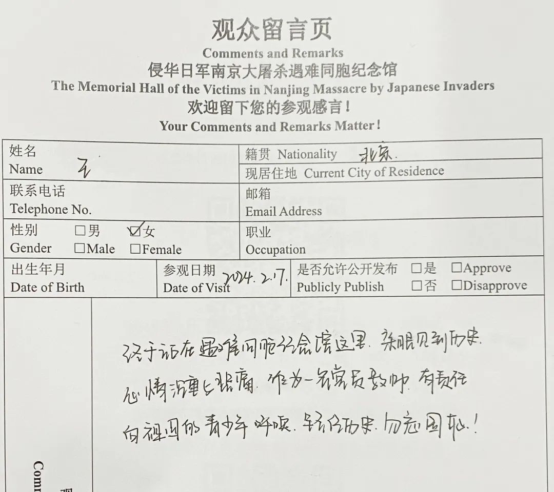 一位来自东北的观众从小接受这段历史的教育,他写道:“大年初一,在这个特别的日子参观纪念馆,意义非凡。今日亲眼见到,感觉无比震撼……”