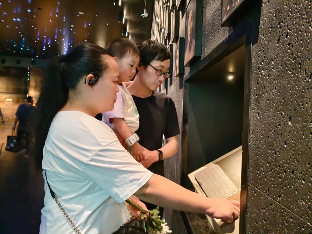 江苏溧阳观众吕文涛和陈婷夫妇带3岁儿子吕宸灝来到纪念馆参观。一家三口在“南京大屠杀史实展”序厅铁书前伫立良久。妈妈陈婷说,9月3日,他们全家围坐在电视机前看九三阅兵直播。“孩子看到先进的武器装备,非常兴奋。我跟他爸爸商量,一定要带孩子来纪念馆看看,让他从小了解这段伤痛历史,培养家国情怀,长大为国效力。”