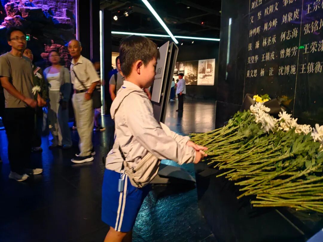 河北石家庄观众李帅带着10岁儿子李沐森来到纪念馆参观。李沐森就读石家庄市实验学校四(1)班。今天本该是上课的日子。父子俩特地都请了假。“这是我们第一次来,预约在9月18日这天。让孩子听着防空警报声,看着纪念馆里的建筑、文物、历史照片,了解南京大屠杀史,在心里种下一颗爱国的种子。”